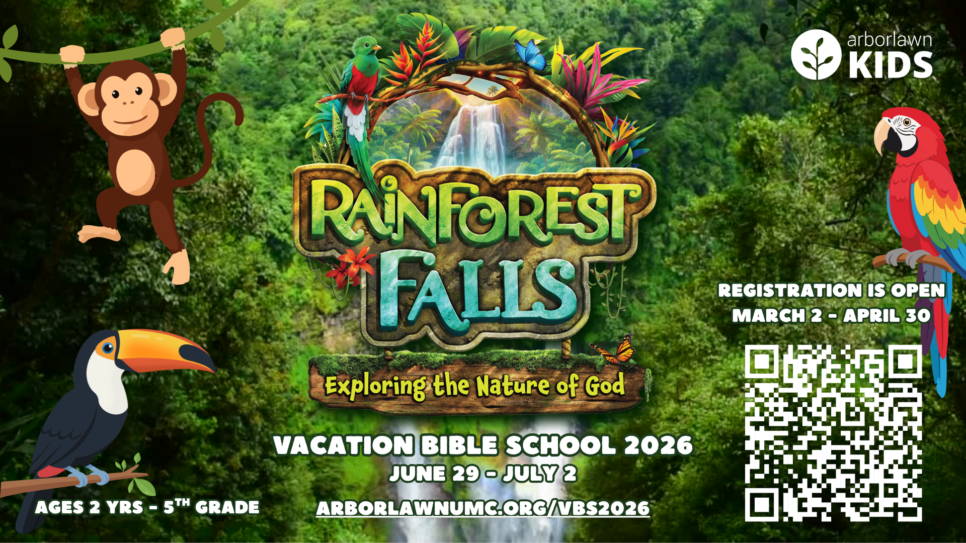 Calling all explorers! If you’ve got a 2 yr old through 5th grader ready for an unforgettable summer adventure, the rainforest is calling. Join us for Arborlawn KIDS VBS 2026: Rainforest Falls happening from June 29–July 2. Registration opens March 2 at 8 AM and you can sign up at arborlawnumc.org/VBS2026 or in the Church Center app under “Sign Ups.”